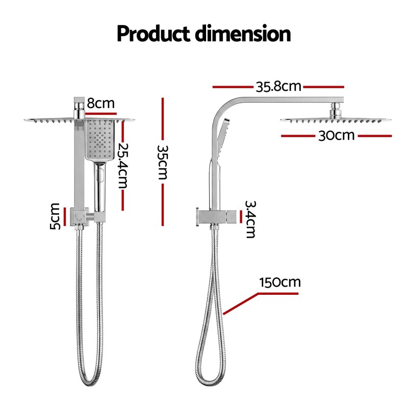 - Overhead shower 300 x 300mm handheld head 80mm hose 1.5m