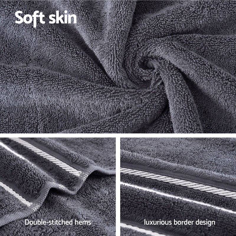 Indulge in spa-like luxury every day with the 6 Pack Bath Towels Set in Grey. Crafted from 100% cotton with a plush 650gsm weight, these towels offer exceptional softness, breathability, and absorbency. The double-stitched edges provide lasting durability, while the elegant border design enhances your bathroom decor. Quick-drying and machine washable, this set is perfect for both comfort and practicality—experience the difference quality cotton makes in your daily routine.