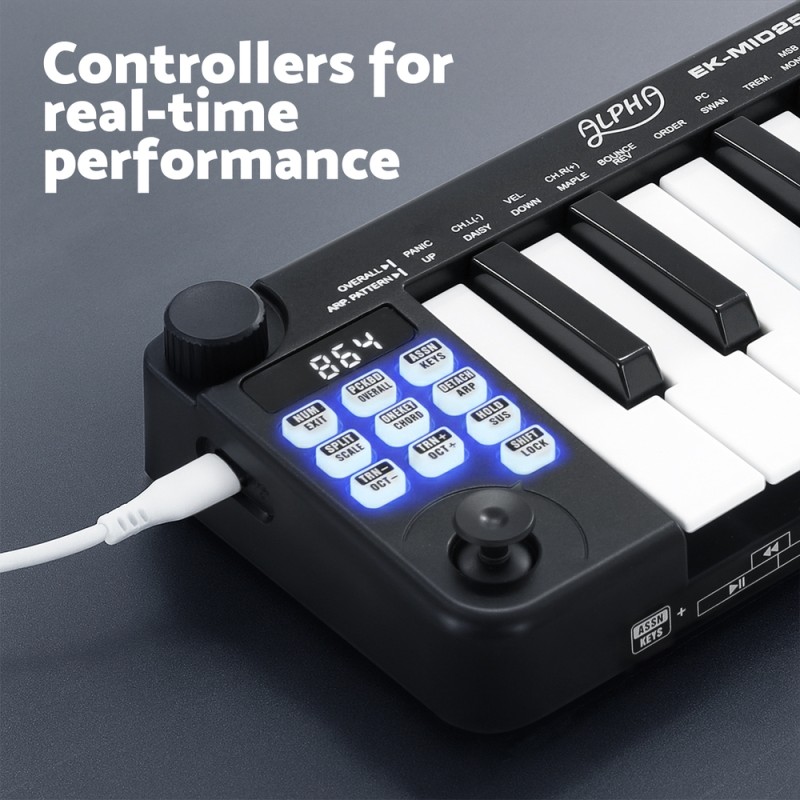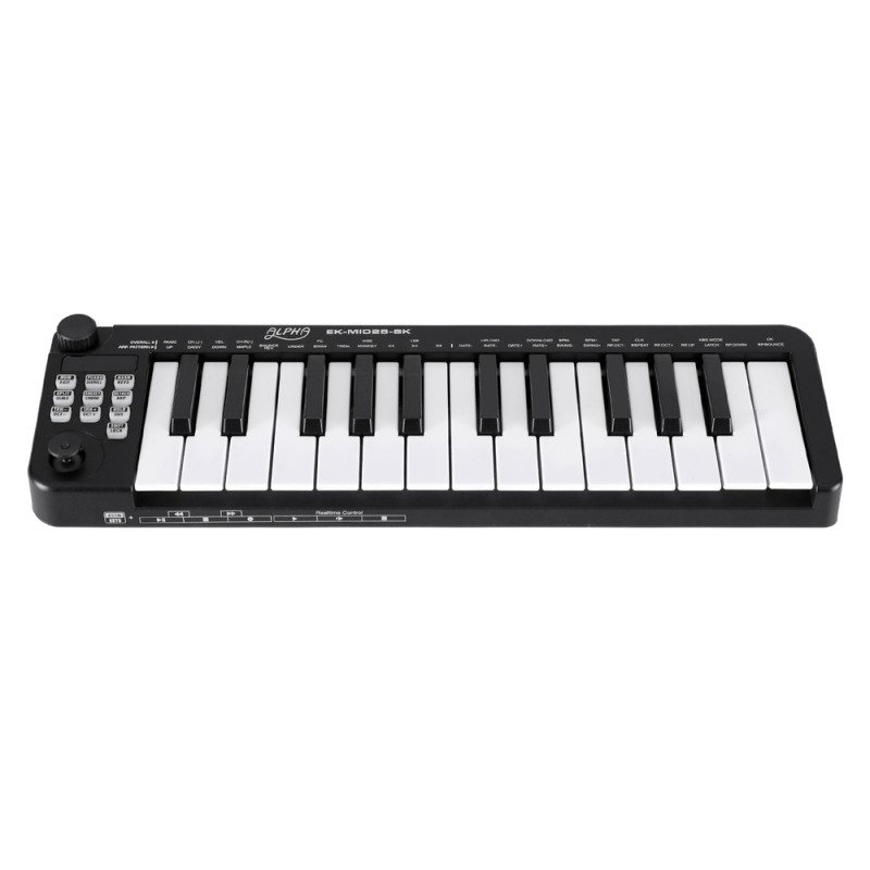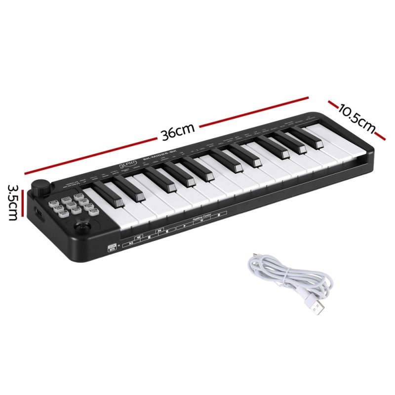 Unleash your musical creativity on the go with the Alpha 25-Key MIDI Keyboard Controller. Designed for seamless portability, it boasts velocity-sensitive keys and a keyboard split function for dual-channel play. Real-time performance takes centre stage with assignable knob and joystick controls, while one-touch chord and intelligent scale features inspire innovation. With a built-in MIDI clock, 5-pin MIDI Out, and pedal port, it's ready for any setup. Its compact design and USB/MIDI combo power make it the perfect companion for laptop use, all housed in a sleek black finish.