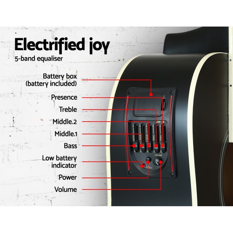 Experience the perfect blend of tradition and innovation with the Alpha 41" Acoustic Guitar. This electric acoustic guitar, featuring a Professional 5-Band EQ, offers rich sound and versatility for musicians of all levels. Crafted from premium laminated linden with a hard wood neck and maple fingerboard, its cutaway design ensures both aesthetic appeal and excellent playability. Complete with a shoulder strap, 3M cable, and picks, this guitar is your ideal companion for home or campfire sessions.
