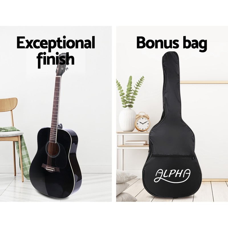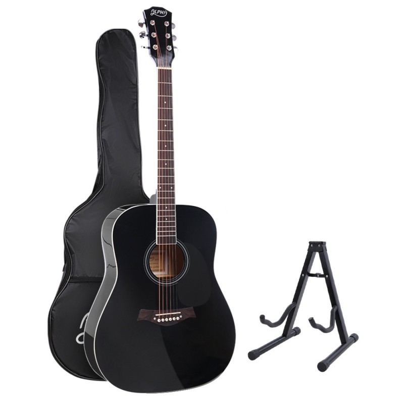 Discover the joy of music with the Alpha 41 Inch Acoustic Guitar. Perfect for porch jams or campfire sing-alongs, this dreadnought guitar features a laminated linden body, hard wood neck, and maple wood fingerboard. Its sleek lacquer finish and wide waist design ensure excellent tone balance and acoustic resonance. Complete with essential accessories like a guitar stand, strap, carry bag, and capo, it's crafted for both sound and style. Enjoy peace of mind with a 1-year warranty.