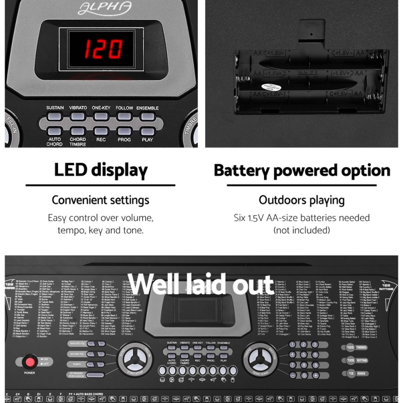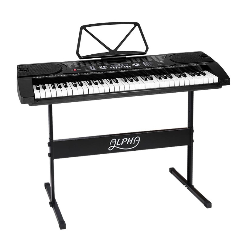 Discover the joy of music with the Alpha 61 Keys Electronic Piano Keyboard. Perfect for beginners, this digital keyboard features 255 rhythms and timbres, 24 demo songs, and intelligent teaching functions. With an LED display, multiple chord options, and effects like sustain and vibrato, it’s designed to inspire creativity. The included adjustable stand and music sheet holder make it easy to set up anywhere, while microphone and headphone jacks allow for both public performances and private practise.