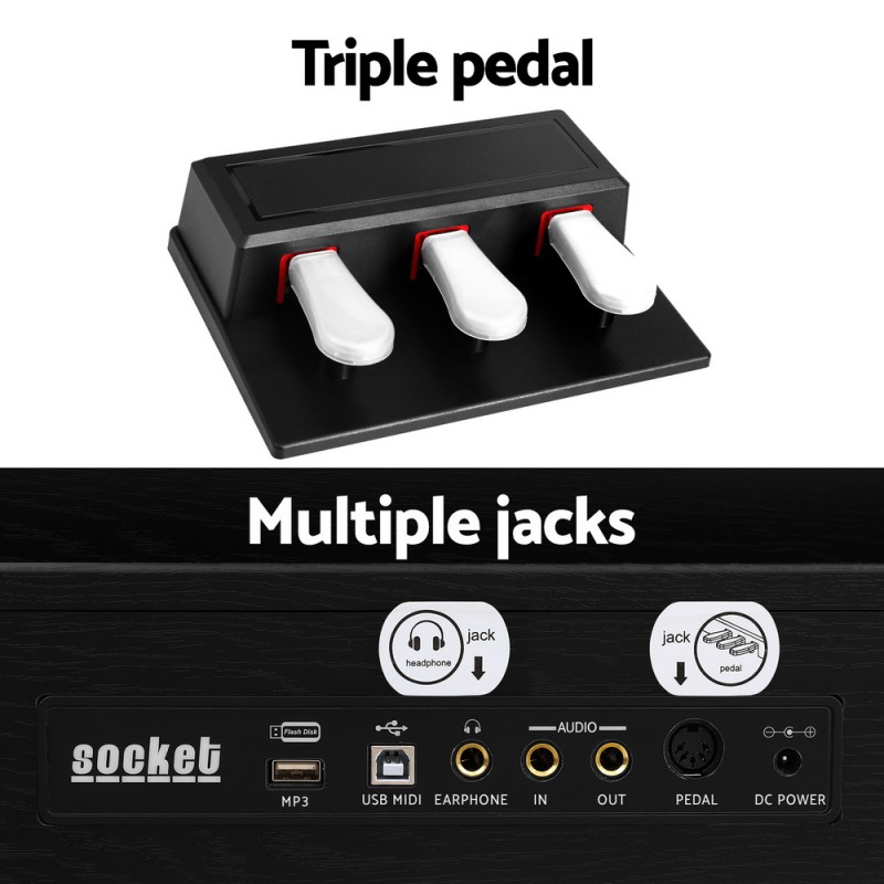 Ignite your passion for music with the Alpha 88 Keys Digital Piano Keyboard. Featuring 88 semi-weighted keys, 800 timbres, 600 rhythms, and 80 demo songs, this versatile keyboard lets you play, record, and experiment with endless musical possibilities. Enjoy intuitive controls on a clear LED display, Bluetooth connectivity, and a robust selection of effect controls. Complete with an adjustable stand, sustain pedal, and music sheet holder, Alpha empowers your creativity, whether practising, performing, or composing. 1-year warranty included.