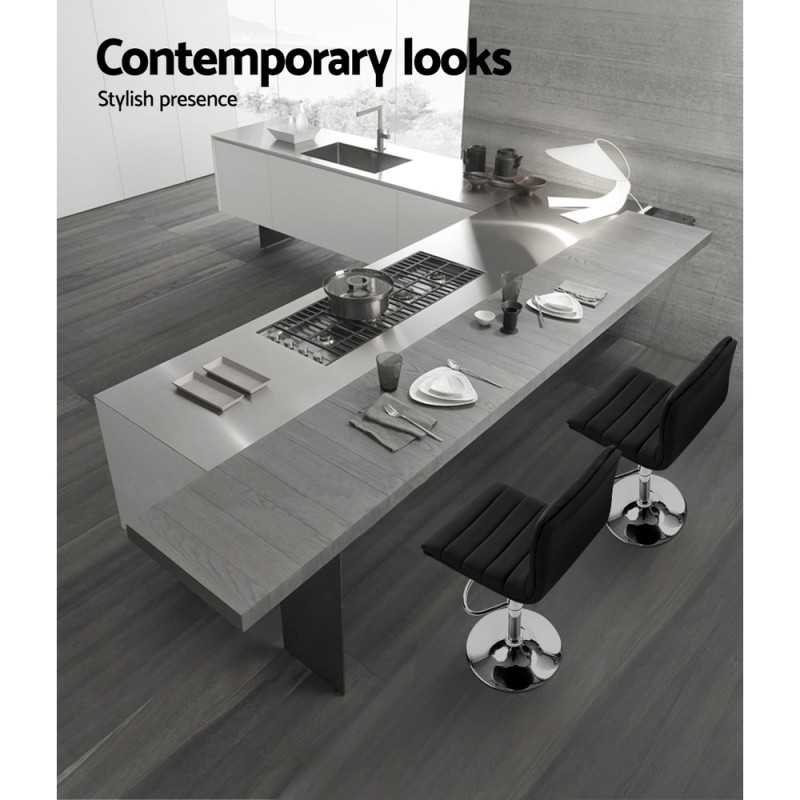 Elevate your living or dining area with the Artiss 2x Bar Stools in sleek black. These stools combine classic design with modern aesthetics, featuring plush faux leather upholstery and an extra-thick foam padded seat for unbeatable comfort. The stools offer a 360-degree swivel, adjustable height via an SGS-tested gas lift, and a semicircular footrest for enhanced relaxation. A corrosion-resistant chrome finish adds durability, while a floor protector ensures your surfaces remain scratch-free. Perfectly blending style and functionality, these bar stools are a sophisticated addition to any space.