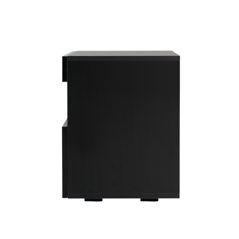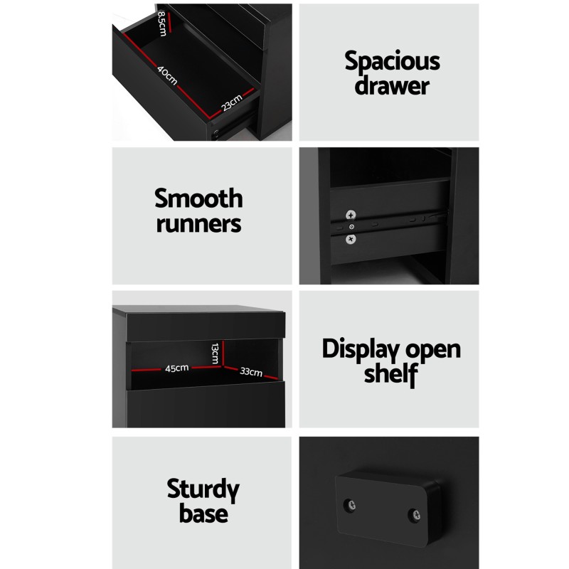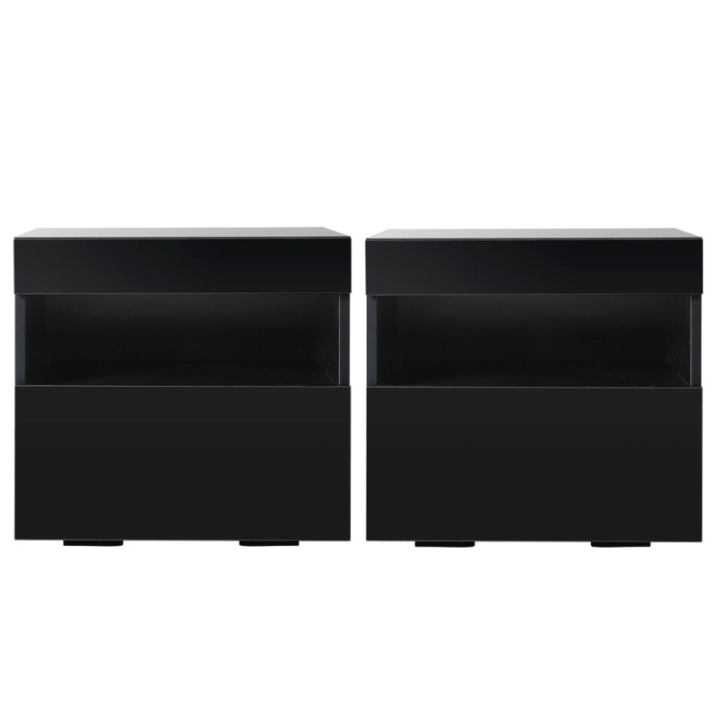 2 Brighten your bedroom with the Artiss 2x LED Bedside Table in black. Each bedside table features built-in LED lighting with 16 colours and four flashing modes so you can set the mood without extra lamps. The handle free modern design, UV high gloss front and sturdy particleboard build create a sleek low maintenance look while a smooth sliding drawer and open shelf keep nighttime essentials organised. Remote requires CR2025 battery not included.