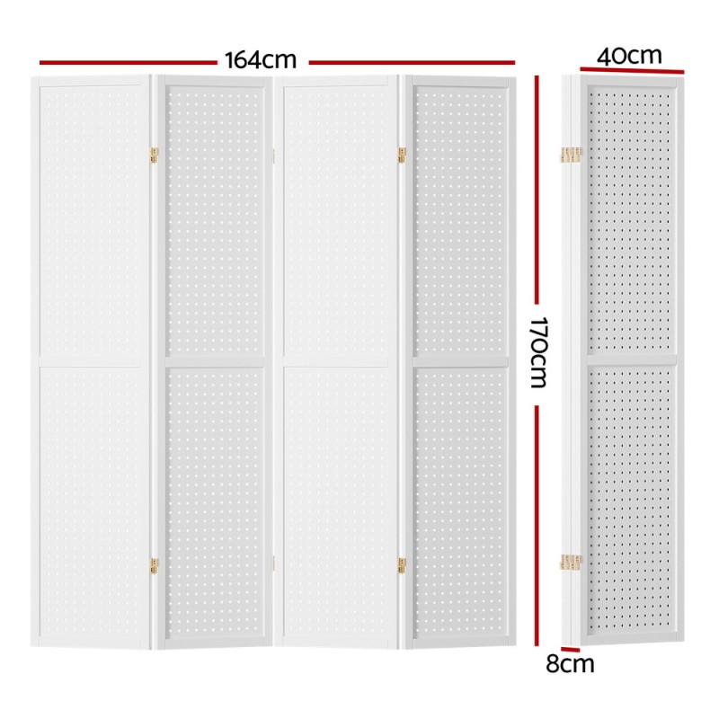 Experience refined versatility with the Artiss 4 Panel Room Divider Screen. This 164x170cm pegboard in elegant white is crafted from solid pinewood and MDF, featuring a unique dual-sided design perfect for both home and office use. Its foldable structure and durable two-way metal hinges offer flexibility and space efficiency. Whether you're seeking privacy, decoration, or a subtle partition, this room divider is the epitome of elegance tailored to your needs. With easy portability and no assembly required, it's a functional and stylish addition to any space.