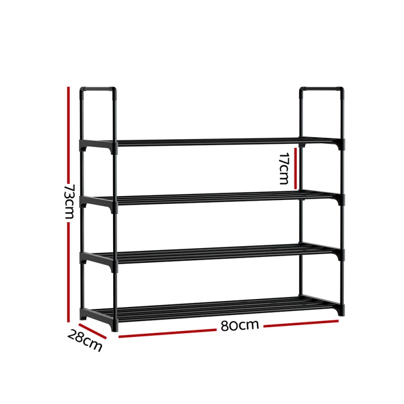 Keep your shoe collection organised and pristine with the Artiss 80cm DIY Shoe Rack. Designed for versatility, this four-tier rack can store up to 16 pairs, thanks to its stackable design. Crafted with black powder-coated metal tubes and non-slip foot pads, it ensures a sturdy and durable structure. Each tier holds up to 10kg, accommodating most shoe types comfortably. With tool-free assembly, setting up is a breeze. Elevate your space and protect your footwear with this stylish, functional solution.