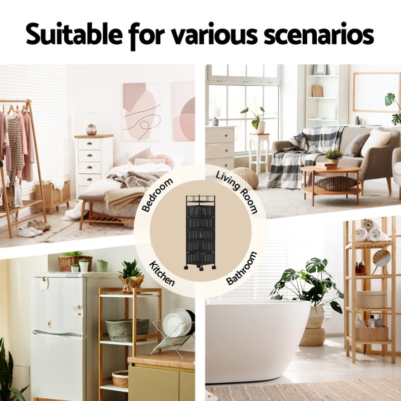 Keep your essentials organised and within easy reach with the Artiss Storage Trolley Kitchen Cart. Featuring five spacious tiers, this sleek black storage rack is perfect for kitchens, craft rooms, home offices or playrooms. Built from a robust yet lightweight steel frame with a durable powder-coated finish, it moves easily on four smooth-rolling wheels—two of which are lockable for added stability. Its compact, vertical design makes the most of your space, while deep trays provide ample storage for all your needs.