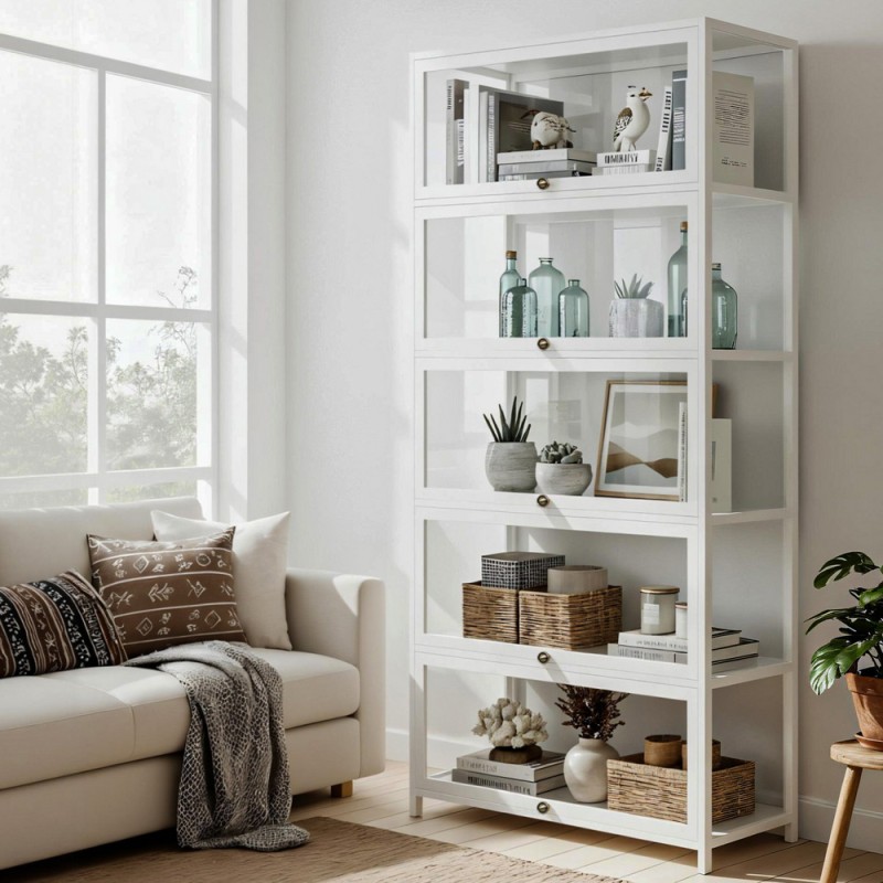 Introducing the Artiss 5-Tier Display Cabinet Storage Bookshelf in elegant white—a perfect blend of versatility and aesthetic appeal. Designed to showcase your books, CDs, DVDs, and cherished collectibles, its transparent acrylic panels offer a seamless view, complementing any decor. The solid bamboo frame ensures durability and resistance to damp conditions, while the flip-top door with magnetic closure offers dust-proof storage. With its space-saving design and ample storage, this cabinet is ideal for any living space. Easy to assemble and maintain, it also comes with an anti-tip kit for safety.