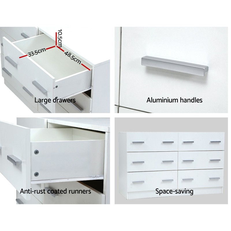 Discover the perfect blend of style and functionality with the Artiss 6 Chest of Drawers - VEDA White. This contemporary lowboy boasts a flawless melamine finish and sleek handles, seamlessly complementing any décor. Crafted from premium 15mm thick particle board with anti-rust coated runners, it offers smooth operation and ample storage with six spacious drawers for all your essentials. Its space-saving design ensures it fits effortlessly into any room, making it an ideal storage solution for modern homes.