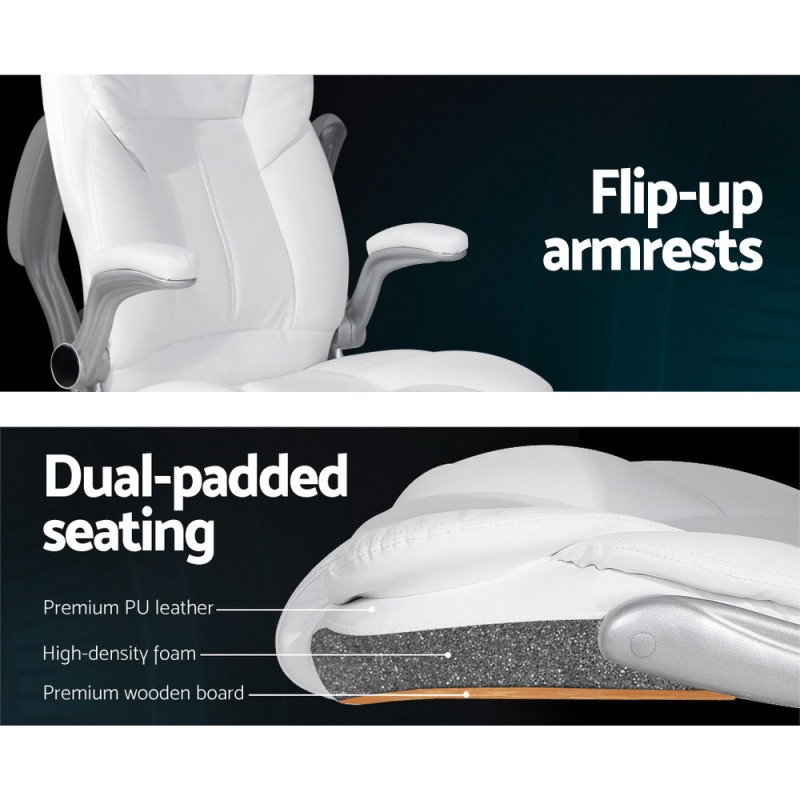 Experience unparalleled comfort with the Artiss 8-Point Massage Office Chair in elegant white PU leather. Perfect for the office, it features a high-back design, S-shaped contour, and a soothing eight-point vibration massage targeting your upper and lower back, hips, and thighs. With five vibration modes and four intensity levels, you can customise your massage experience using the handy remote. Enjoy the convenience of a 15, 30, or 60-minute timer, making relaxation easy during breaks. The chair also boasts flip-up armrests, tension tilt adjustment, a stylish chrome base, 360° rotation, and height adjustment. Elevate your workday comfort with this exquisite piece from Artiss.