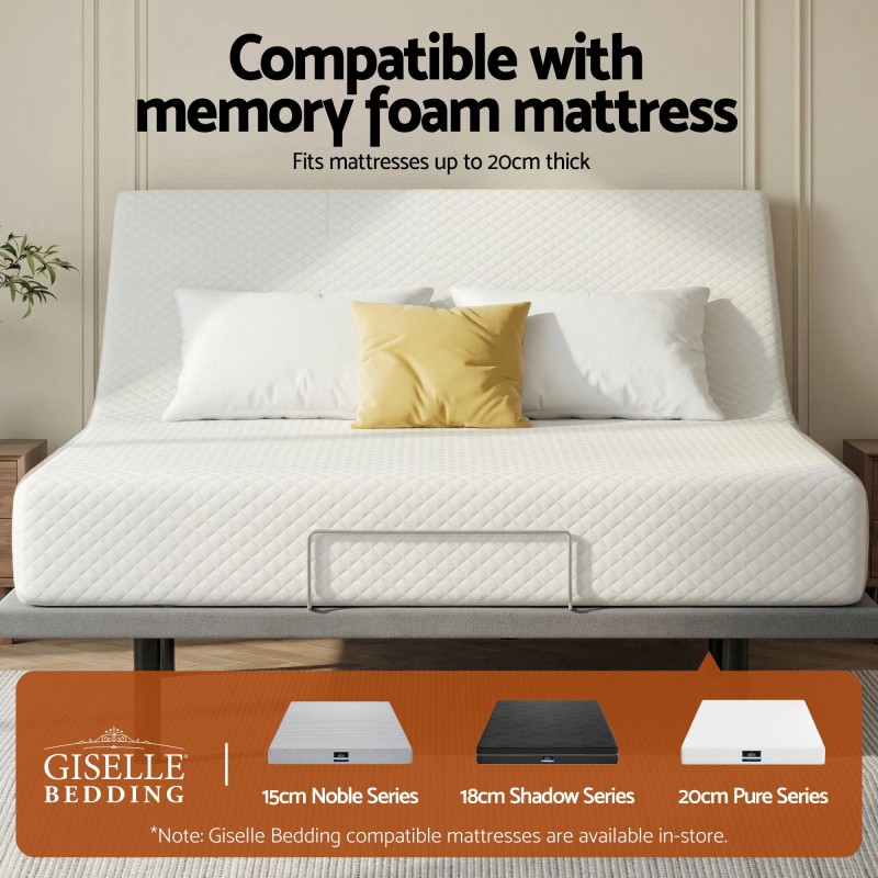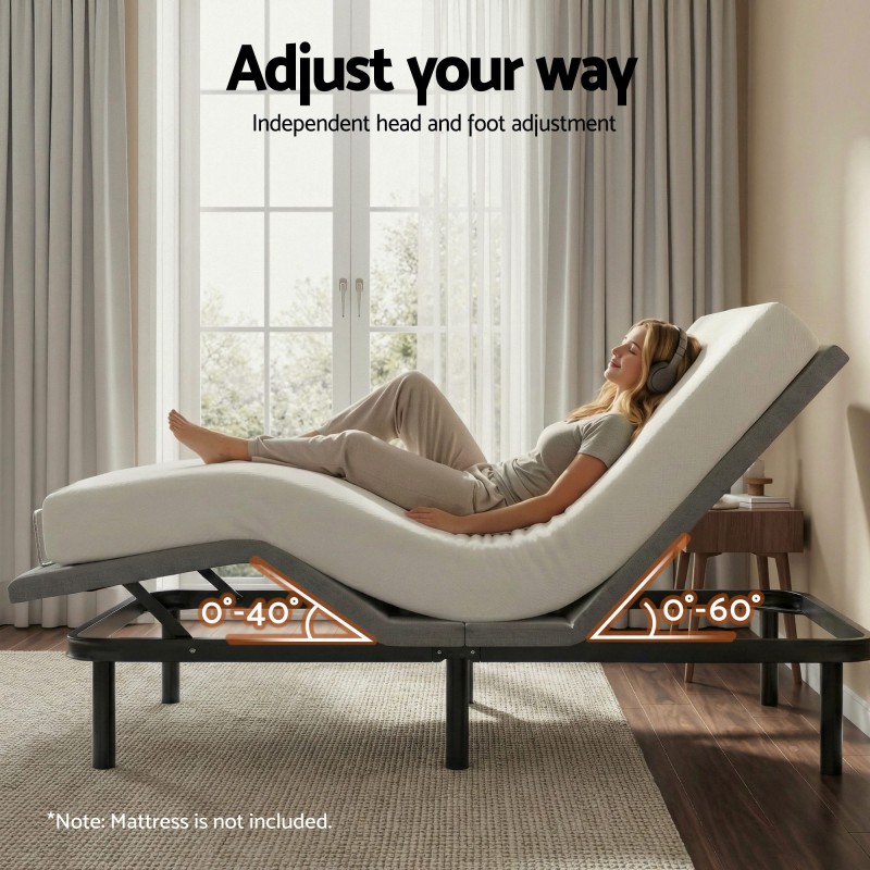 Upgrade your sleep with the Artiss Adjustable Bed Frame Queen Size. Designed for modern comfort, this electric bed base features independent head (0–60°) and foot (0–45°) adjustment, a Zero Gravity preset to relieve body pressure, and a sturdy 420kg load capacity. Easily customise your position with the wireless remote and enjoy quick assembly. Perfect for relaxation, recovery, or improving sleep quality, this bed base suits memory foam mattresses up to 20cm and includes a mattress guard bar for added stability.
