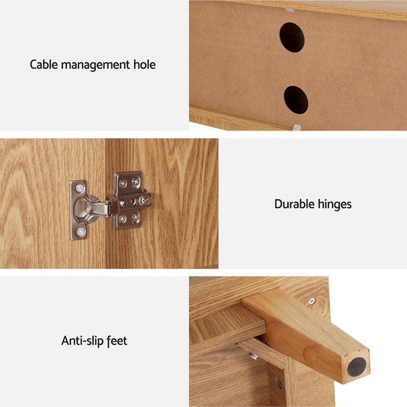 Stylish, sophisticated, and incredibly practical, the Adwen TV Entertainment Unit from Artiss is the home entertainment solution for you. Constructed from solid and durable 15mm particleboard, this modern piece can hold your entyre entertainment suite, including televisions, sound systems, and game consoles. The unit features two deep cabinets with durable hinges to store cables, books, movies, or other essentials. Cable management holes make organising your cords easy. Anti-slip feet keep the unit stable and prevent damage to floors.