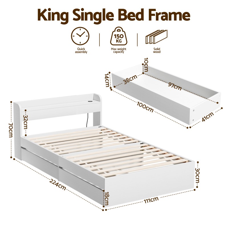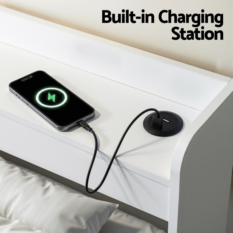 The Artiss Aura Single Bed Frame in white combines practical storage and modern convenience with a roomy headboard, two underbed drawers and built in USB charging ports. Built from sturdy 15mm and 18mm particleboard with plywood slats and centre support beams the Aura is designed for strong noise free support and everyday bedroom functionality while maintaining a clean contemporary look.