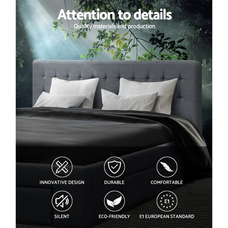 Transform your bedroom into a sanctuary of style and comfort with the Artiss Avio King Size Bed Frame. Upholstered in premium grey faux linen and padded with high-density foam, this bed frame features a sophisticated tufted headboard, sturdy steel frame, and reinforced metal bars. The wooden arched slat base and centre support strut ensure durability, while four spacious drawers on wheels provide convenient under-bed storage. Its neutral tone suits a range of decors for effortless elegance and functionality.