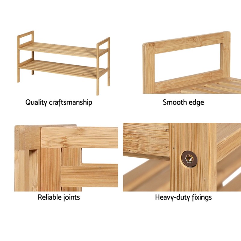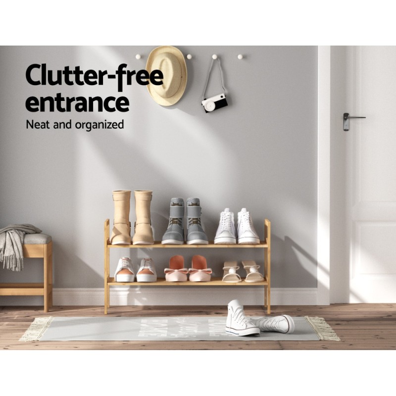 Keep your home neat and stylish with the Artiss Hina Shoe Rack. Crafted from quality bamboo, its natural wood grain complements any decor. The two-tier design offers ample space for up to six pairs of shoes, ensuring your entrance remains clutter-free. Gaps in the shelves promote airflow, preventing dampness and mildew. Easy to assemble and maintain, this durable rack is a must-have for organised living. Enjoy peace of mind with a one-year warranty.