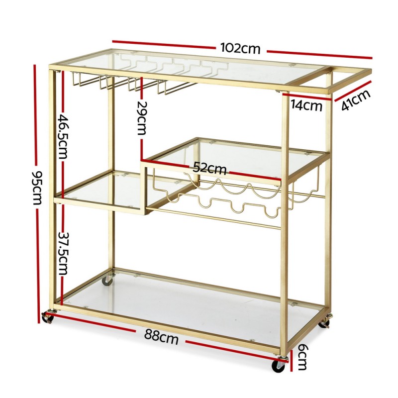 Elevate your home entertaining with the Artiss Bar Cart Drink Trolley. Crafted with mirrored tempered glass shelves and a sleek gold metal frame, this 102cm cart combines elegance and durability. Its removable wine racks and glass holders offer customised storage, while 4 universal casters (2 lockable) ensure easy mobility. The versatile push bar also serves as a towel rack, and the waterproof surface simplifies cleaning. Whether as a kitchen island, serving cart, or home bar, this stylish piece enhances any space. Quick assembly with clear instructions means you can enjoy it right away. Order yours today!