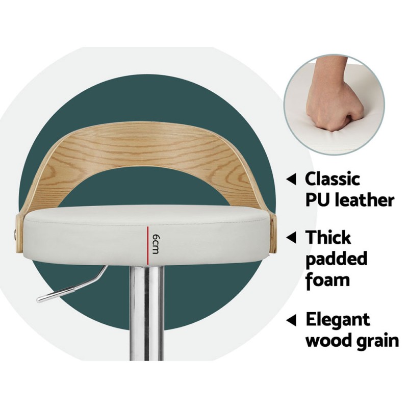 Elevate your space with the Artiss Publia Bar Stools. Perfect for coffee catchups or daily living, these stools feature a curved bentwood seat, plush PU leather upholstery, and a 360° swivel. With an elegant wood grain finish, adjustable height, and sturdy base, they blend seamlessly into any décor. Enjoy comfort and style with soft padded seats, a semi-circular footrest, and floor protectors. Choose from two colours to suit your taste and make a luxurious addition to your home.