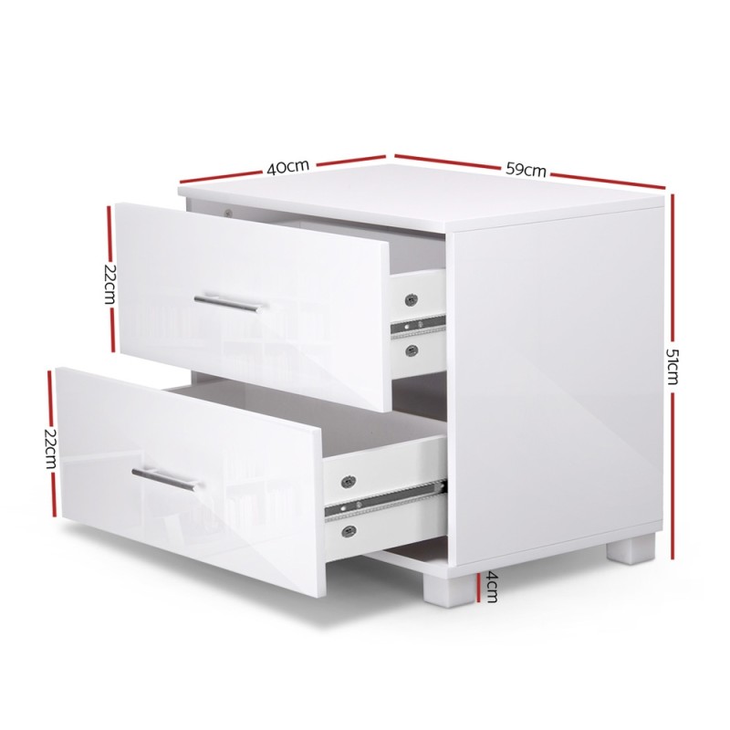 Why settle for ordinary when you can have the Artiss Bedside Table? This sleek, modern piece is the perfect companion for your bed, offering extra storage with its two spacious drawers. Crafted from 15mm thick MDF and particle board, it boasts a high gloss UV finish and elegant aluminium handles. With anti-rust metal drawer runners and a reinforced base, it's built to last. Ideal for your bedroom or as a side table, it’s easy to clean and assemble. Elevate your space with style and functionality.