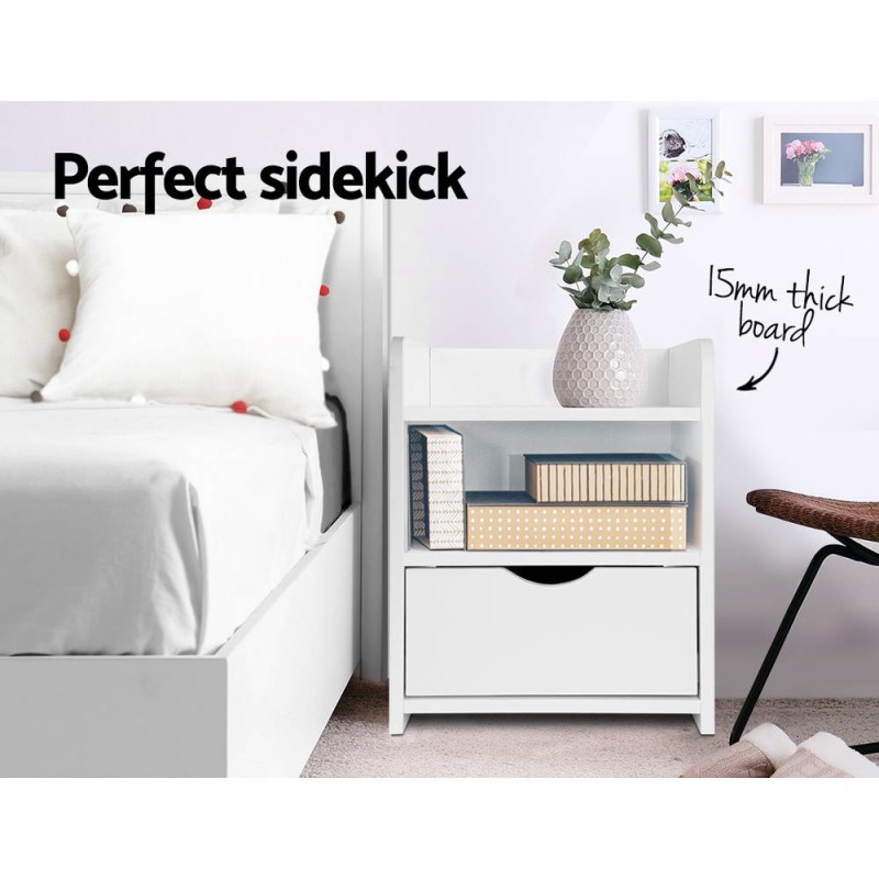 Transform your bedroom with the Artiss Bedside Table 1 Drawer with Shelf - FARA in elegant white. This versatile bedside table combines timeless design with practical functionality, featuring a drawer and shelving unit for your essentials. Built with durable 15mm thick LDF boards, it ensures stability and longevity. Its solid construction is complemented by safe round corners and anti-rust coated metal sliders, while a flushed gap handle adds a sleek touch. Easy to clean and maintain, this bedside table is both stylish and practical, making it a perfect addition to any bedroom.