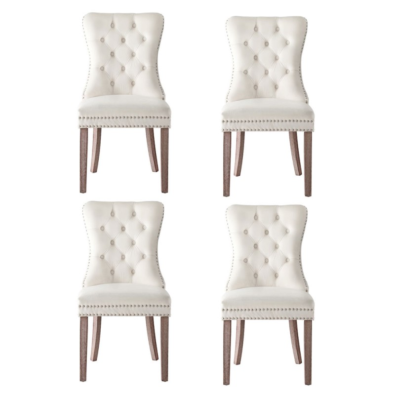 Elevate your dining experience with the Artiss Set of 4 Dining Chairs in elegant beige velvet. Featuring plush velvet upholstery, a button-tufted backrest, and stylish rivet edging, these chairs effortlessly blend timeless charm with modern comfort. The cushioned high-resilience foam backrest and sturdy rubberwood legs provide lasting support, while anti-slip feet protect your floors. With a 150kg weight capacity and easy assembly, these chairs are the perfect addition to any dining room. 1-year warranty included.