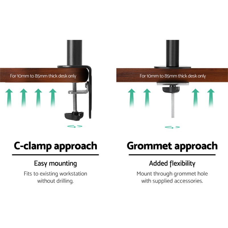 Enhance your workspace with the Artiss Monitor Arm Dual Desk Mount. This fully adjustable arm offers extended mobility, allowing you to custom set your viewing position with ease. Rotate, swivel, or tilt your monitor to achieve the perfect angle, whether in portrait or landscape format. Built from heavy-duty steel, it supports two monitors up to 32" with a weight capacity of 9kg each. Additional features include cable management, an allen key holder, and easy assembly with all hardware included.