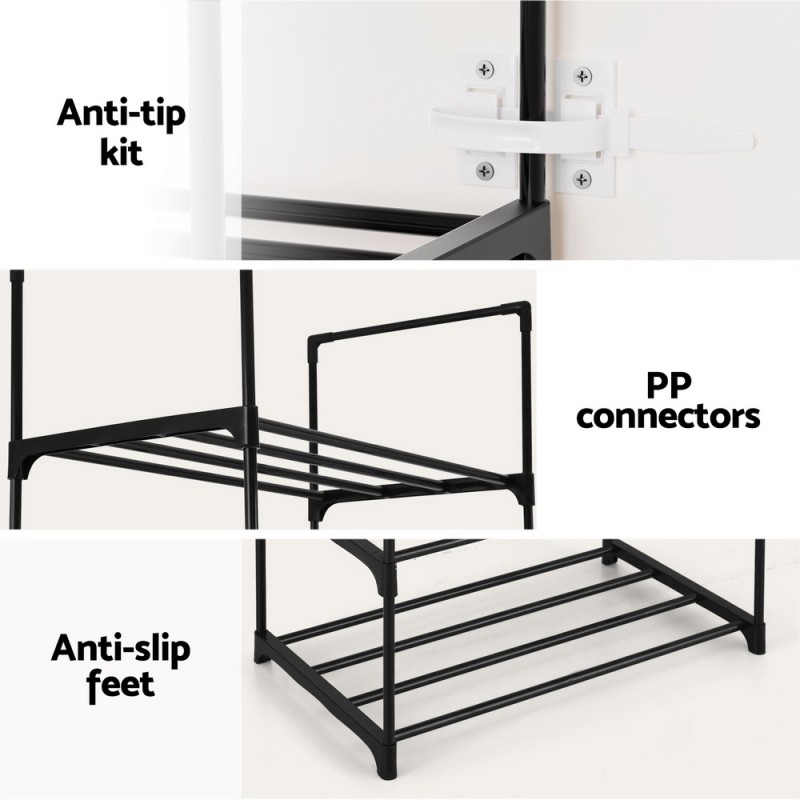 Enhance your shoe storage with the Artiss Dunn Shoe Rack DIY Stackable 10-tier in Black. Designed for growing shoe collections, this versatile rack offers a sturdy and durable frame made from powder-coated metal and plastic connectors. With a 5kg weight capacity per shelf, it holds up to 20 pairs of shoes and other essentials, while ensuring easy ventilation to prevent bacterial growth. Its customised, stackable design allows for tool-free assembly in various configurations, perfectly fitting your entryway or wardrobe.