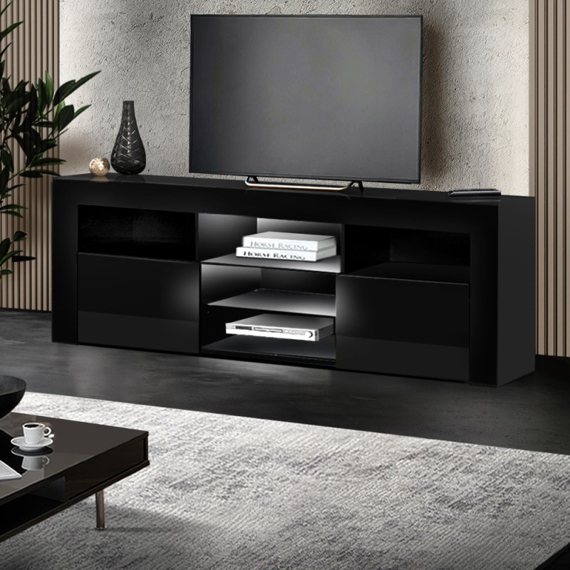 Enhance your living room with the Artiss Entertainment Unit TV Cabinet LED 160cm Black Bobi. This stunning unit features customised LED lighting with 16 vibrant colours and 4 effects, setting the perfect ambience for your home entertainment. Its sleek, modern design boasts a high-gloss UV finish and push-to-open cabinets for a seamless look. With two spacious cabinets and five open shelves, it offers ample storage for all your needs. Elevate your entertainment space with style and functionality.
