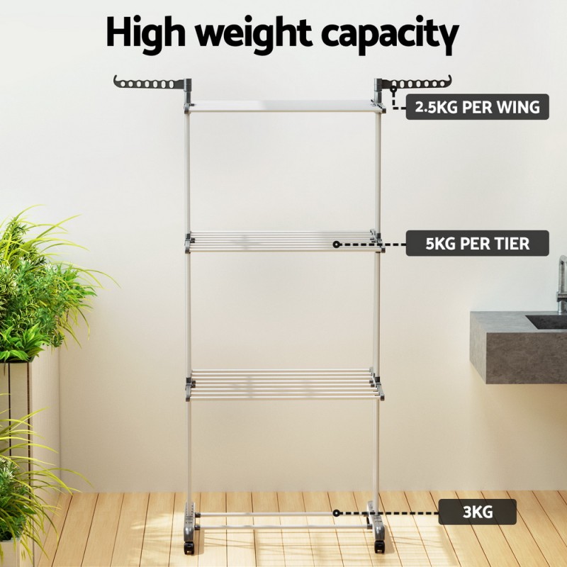 Prepare for laundry day with the Artiss Clothes Drying Rack, a heavy-duty, 3-tier solution for all your drying needs. Crafted from sturdy powder-coated metal and solid plastic, it supports up to 20kg of laundry. With three tiers, two side hooks, and two lower bars, it offers ample space and airflow for fast drying. Lightweight and portable, it features lockable wheels for easy movement. Fold it away when not in use. Enjoy fast, convenient drying with Artiss.