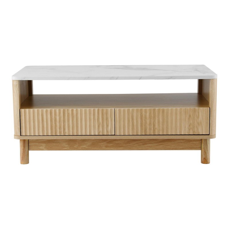 Elevate your living space with the Artiss Coffee Table, blending modern sophistication and practical design. Featuring a marble-effect tabletop and an elegant fluted drawer panel, this table is the perfect centrepiece for any contemporary home. The spacious open shelf and two smooth-sliding drawers keep essentials organised, while pine wood legs offer lasting durability. Safe round corners and easy-clean surfaces ensure this table is as family-friendly as it is stylish, making it a must-have addition to your lounge room.