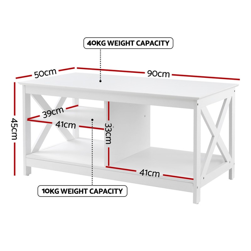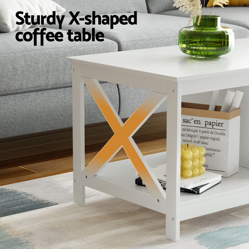 Bring a touch of coastal charm to your home with the Artiss Coffee Table Storage Shelf in White. This stylish 3-tier centrepiece features sturdy X-shaped legs wrapped in melamine veneer for industrial support, while its spacious open shelves offer flexible storage and display options for your decor. The stain-resistant surface is easy to clean, and smooth edges plus floor protectors make it ideal for any living space, from beach houses to city apartments. Effortless to assemble, it’s the perfect blend of form and function.