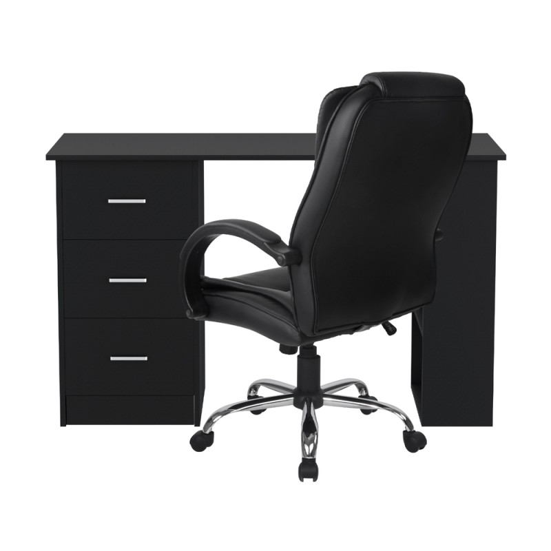 Upgrade your workspace with the Artiss Computer Desk and Executive Office Chair Set. This stylish combo features a compact 120cm desk with three drawers, 3-tier open shelves, anti-rust metal runners, and anti-slip base for durability and stability. The high-back office chair is upholstered in sleek black PU leather, offering multi-layer padding, adjustable height, tilt, 360° swivel, and a sturdy chrome base with five castor wheels. Functional and modern, this set is perfect for any home office or study and comes with a 1-year warranty.