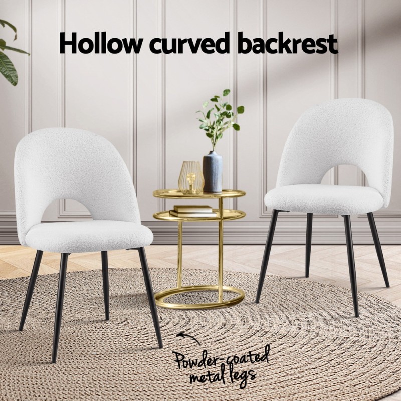 Elevate your home with this Set of 2 Artiss Dining Chairs, designed for ultimate comfort and modern style. Upholstered in premium white Sherpa fabric, each chair features a curvy hollow backrest that promotes airflow and ergonomic support. High-resilience foam and plush padding ensure lasting cosiness, while sturdy powder-coated steel legs with anti-slip protectors provide stability on any floor. Ideal for dining rooms, lounges, or bedrooms, these chairs support up to 150kg, are easy to assemble, and simple to clean. Includes a 1-year warranty.