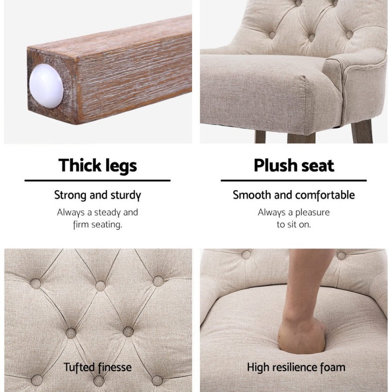 Infuse your dining space with the timeless allure of French Provincial charm with the Artiss Cayes Dining Chairs Set of 2. These exquisite chairs are upholstered in luxurious amber taupe linen, enveloping a deep 13cm high resilience foam for comfort and durability. The solid rubber wood frame ensures stability, while the tufted button design, iconic curved back legs, and elegantly turned front legs add sophisticated flair. Perfect for any dining area, these chairs are a true symbol of elegance and style.