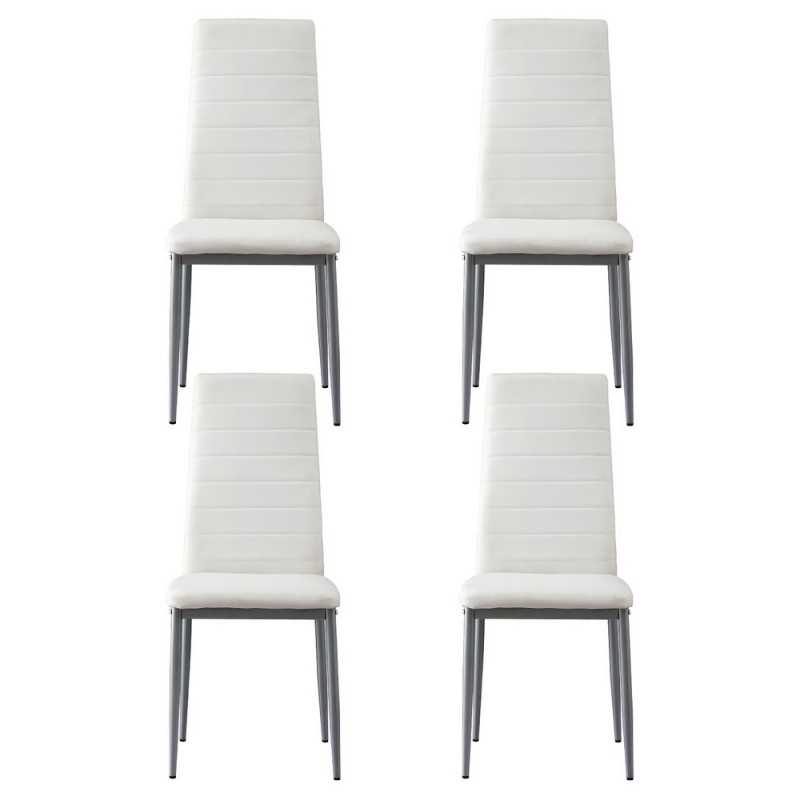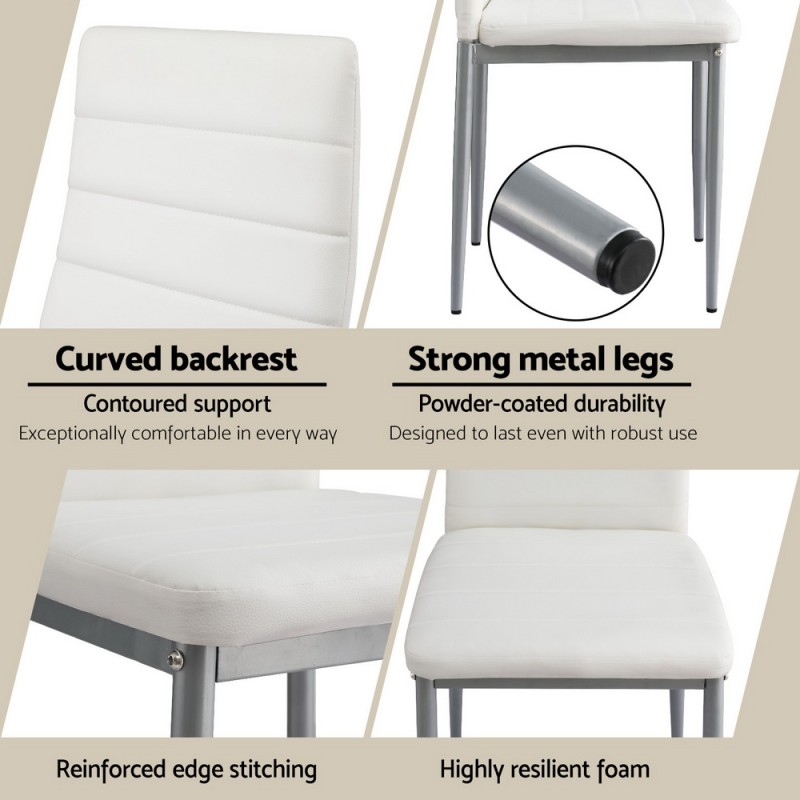 Elevate your dining experience with the Artiss Astra Dining Chairs Set of 4. Featuring elegant channel tufting and a sleek matt white PVC finish, these chairs blend sophistication with comfort. The tall, supportive backrest and well-padded, waterproof seat ensure lasting comfort, while rust-resistant powder-coated metal legs provide sturdy durability. Easy to assemble and maintain, the Astra Dining Chairs offer refined style and practical reliability for any modern dining space.