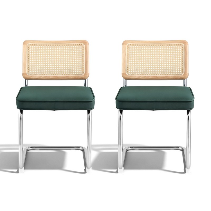 Elevate your dining experience with the Artiss Dining Chairs Set of 2 in Velvet Rattan Cantilever Green. These stunning chairs feature a unique cantilevered stainless steel frame paired with a chic wood grain and rattan backrest, creating a modern, designer look. The plush velvet upholstery over high-resilience foam ensures unparalleled comfort, while the contrast between the soft velvet and woven rattan delivers a distinctive aesthetic. Built with safety in mind, these chairs come with rounded edges and anti-slip feet to protect your floors. Perfect for any stylish kitchen, lounge, or café, these chairs require easy assembly to add a touch of architectural flair to your home.