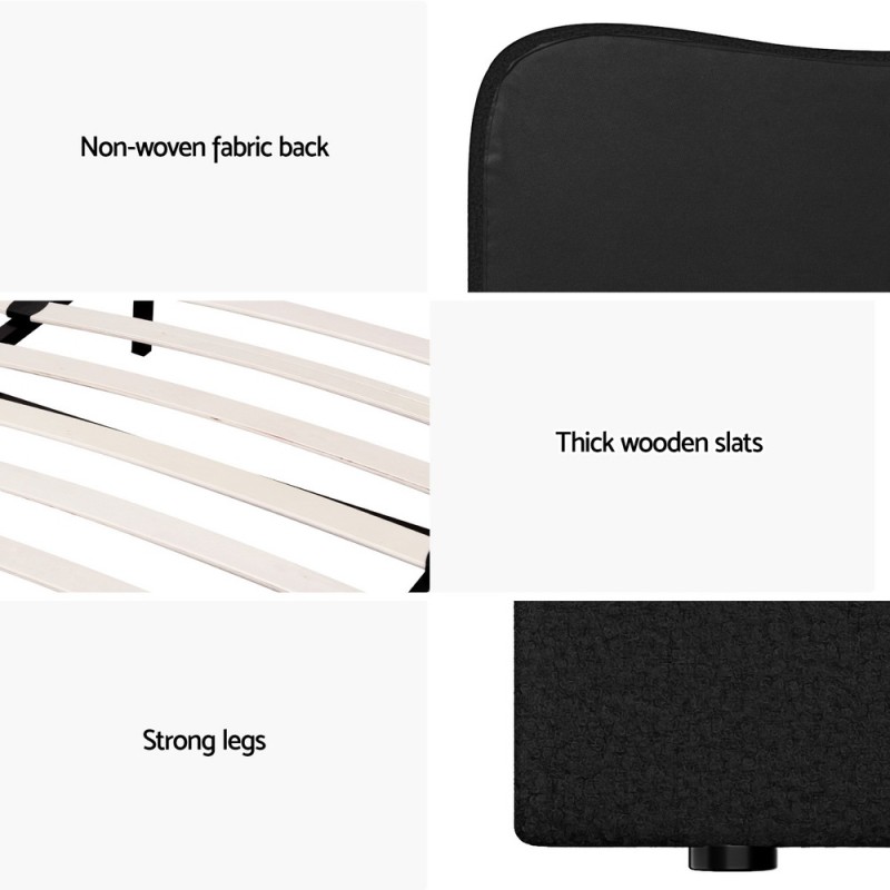 Elevate your bedroom with the Artiss DARA Double Bed Frame, expertly upholstered in luxurious bouclé fabric. Designed for both style and support, it features a durable pine wood frame, sturdy plywood slats, a foam-padded headboard, and secure metal connectors. The smooth edge finish and chic black colour blend seamlessly with any decor, while easy assembly ensures convenience. Enjoy a restful night, backed by a 1-year warranty. *Note: Actual colours may vary due to lighting and screen differences.