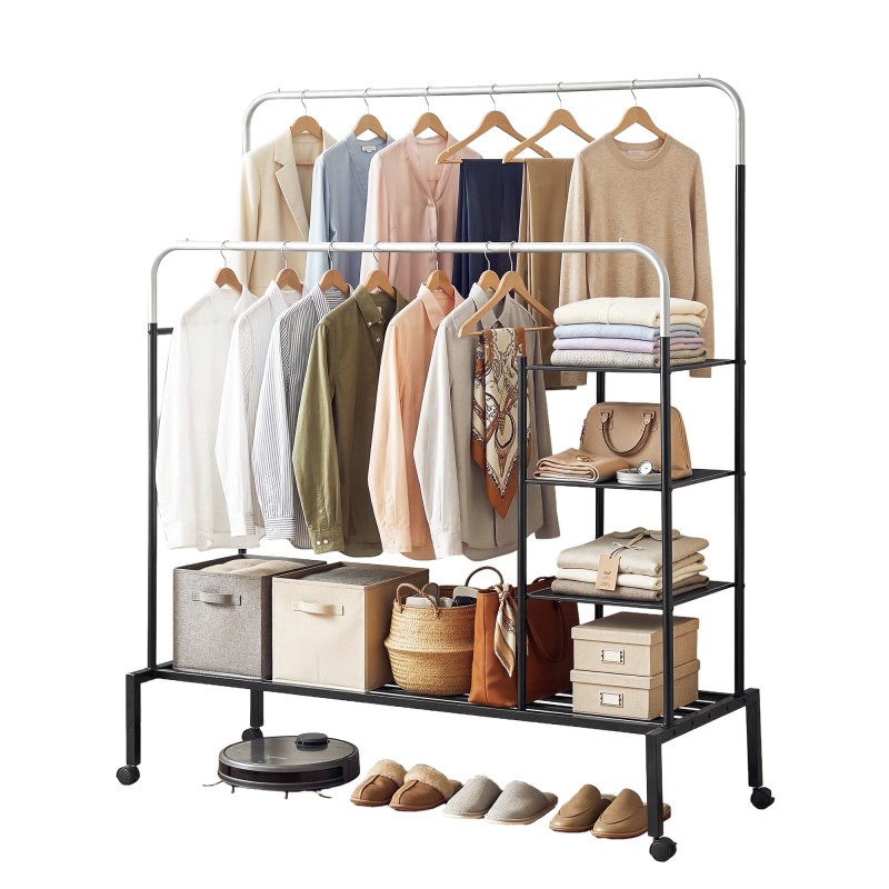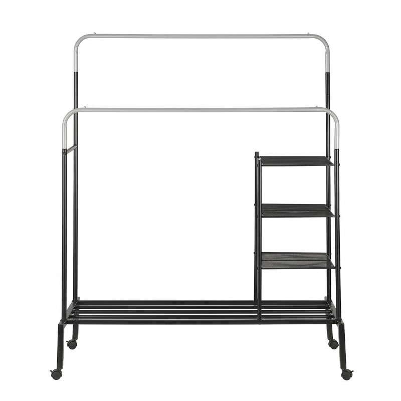 The Artiss Clothes Rack is a sturdy and versatile 4-in-1 storage solution for home or studio. Featuring double hanging rods, three mesh shelves and a bottom shelf it offers ample space for garments shoes and boxes. Built from heavy duty carbon steel with anti-falling devices and smooth 360° swivel casters with two lockable wheels the rack combines durability with mobility for organised everyday use.