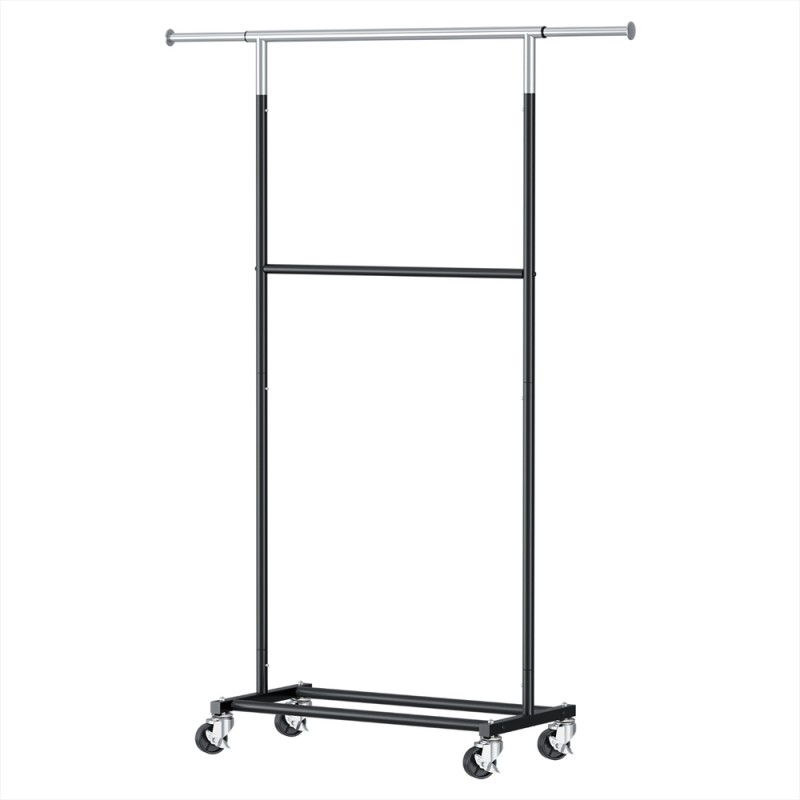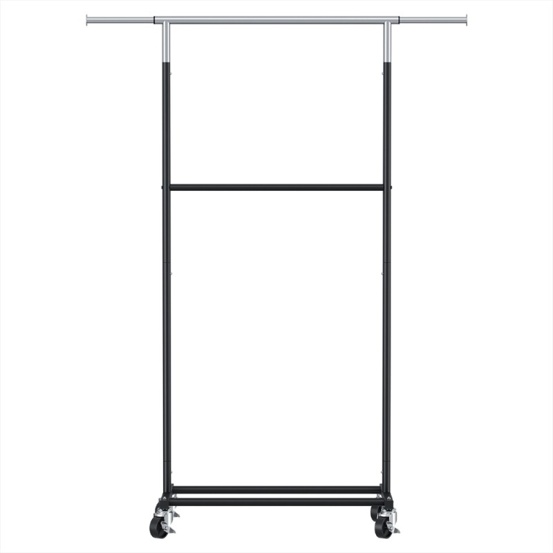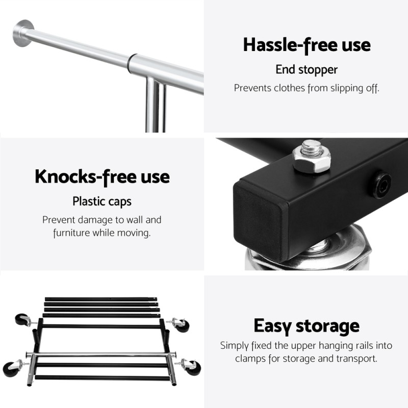 Effortlessly organise your wardrobe with the Artiss Clothes Rack Double Rod Airer Rail Coat Stand. Crafted from heavy-duty, corrosion-resistant metal with a stylish silver and black finish, this rack features adjustable horizontal rods for versatile storage, smooth 360° swivel casters with two lockable wheels, and anti-slip stoppers. Protective plastic caps prevent wall damage, and the rack collapses for easy storage, perfect for homes, rentals, or retail spaces.