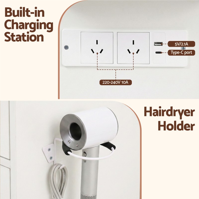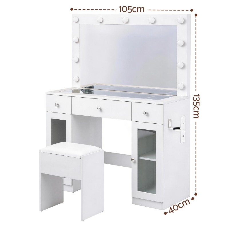 The Artiss Dressing Table Vanity Desk blends sleek modern design with practical features for effortless makeup and grooming. A large Hollywood mirror with 11 USB LED bulbs offers three-colour modes for balanced lighting while RGB ambient lighting adds atmosphere. The transparent tempered glass top sits above smooth sliding drawers and two cabinets to keep essentials organised. Includes a padded stool with hidden storage hairdryer holder built in charging station anti tip strap and floor protectors for stability and ease of use.
