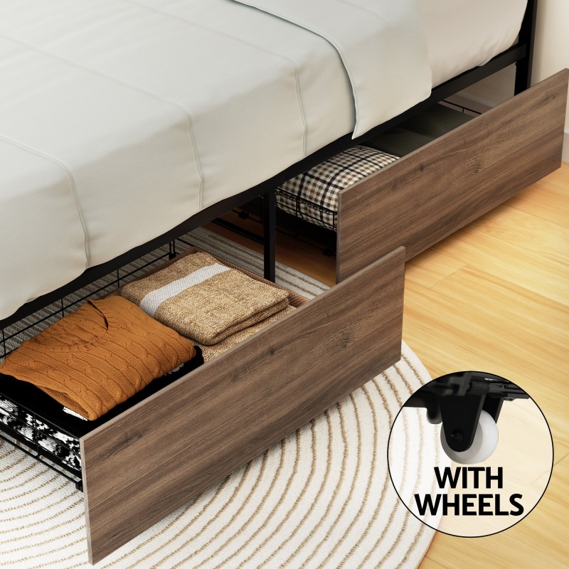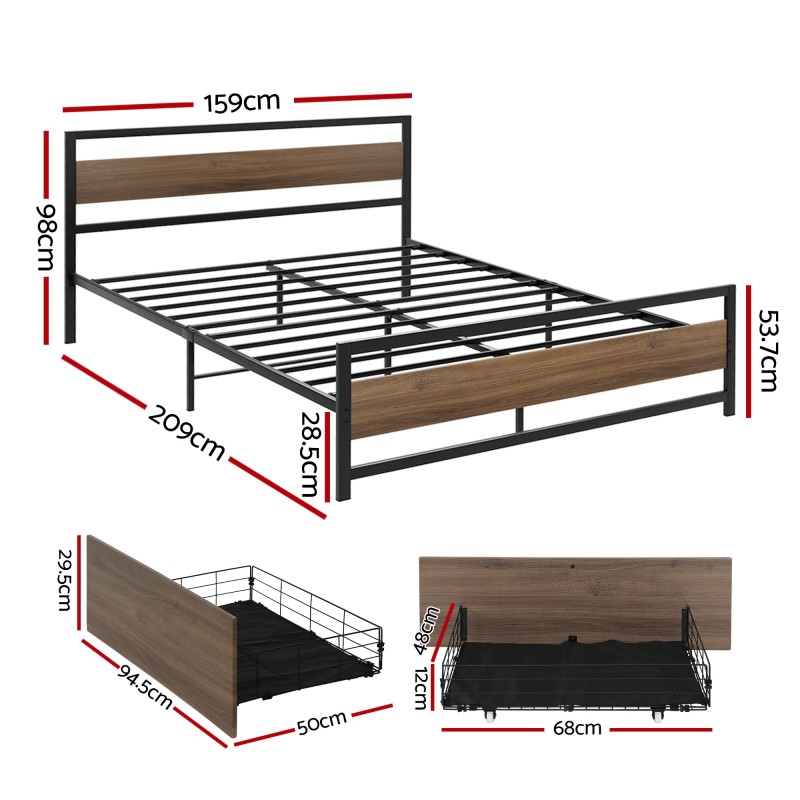 The Artiss DREW Queen bed frame blends industrial style with practical storage. Built from powder coated rust resistant steel with reinforced centre slats and a thick walnut MDF headboard the frame supports standard Australian queen mattresses while providing two smooth castor drawers for organised underbed storage. Rubber foot caps protect floors and the perfect fitted slot design makes assembly straightforward.