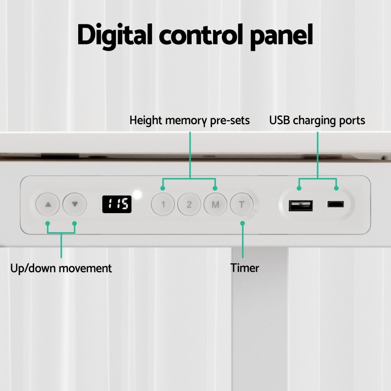Enhance your workspace with the Artiss Standing Desk Motorised Electric Desk, designed to promote better posture and health. This sleek, white desk features a stepless height-adjustable frame, allowing you to effortlessly switch between sitting and standing. Its user-friendly digital control panel lets you set and save up to two height presets, while a handy reminder mechanism suggests optimal moments to change positions. The ultra-quiet motor ensures smooth transitions, and a large drawer keeps essentials organised. With built-in USB ports, charging your devices is a breeze. Easy to assemble and maintain, this desk is your key to improved productivity.