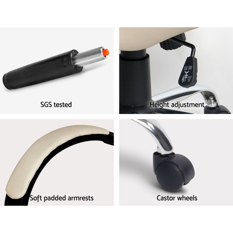 Elevate your workspace sophistication with the Artiss Executive Office Chair in Leather Tilt Beige. This contemporary masterpiece is crafted from premium PU leather, offering a high-back design with multi-layer padded seating and plush headrest and armrests for ultimate comfort. Its chrome base ensures durability, featuring easy height adjustment, tilt function, and 360-degree swivel capabilities. Effortlessly gliding on five smooth castors, this chair is both easy to assemble and maintain, requiring just a damp cloth for cleaning. Designed for luxury and functionality, the Rainier Office Chair is your go-to for unparalleled comfort and style.