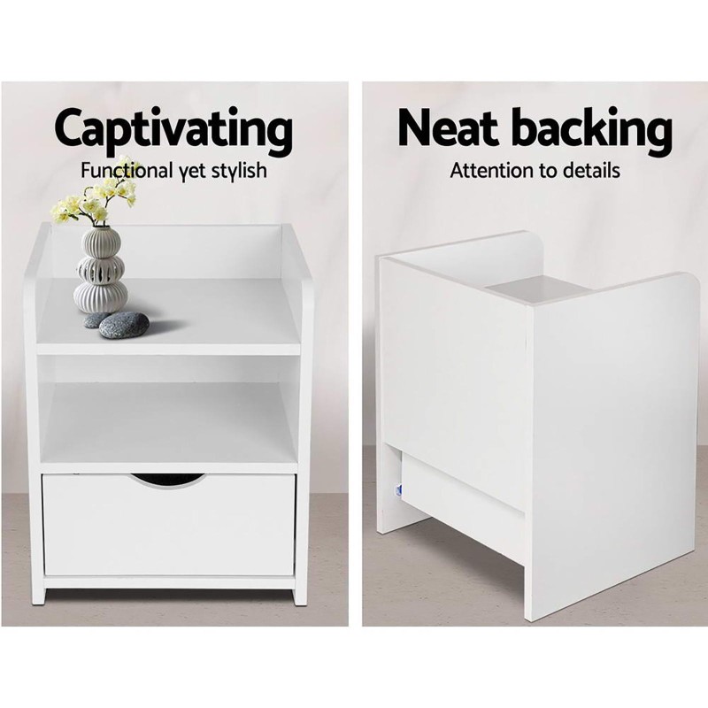 Enhance your bedroom with the Artiss FARA 2X Bedside Table. Featuring a sleek white finish, each table offers a spacious drawer and two shelves for all your essentials. Built from sturdy 15mm LDF board with safe round corners, anti-rust metal sliders, and a modern flushed gap handle, it blends style with functionality. Easy to clean and perfect for any room, the FARA Bedside Table delivers both elegance and durability. Assembly required. Includes a 1-year warranty.