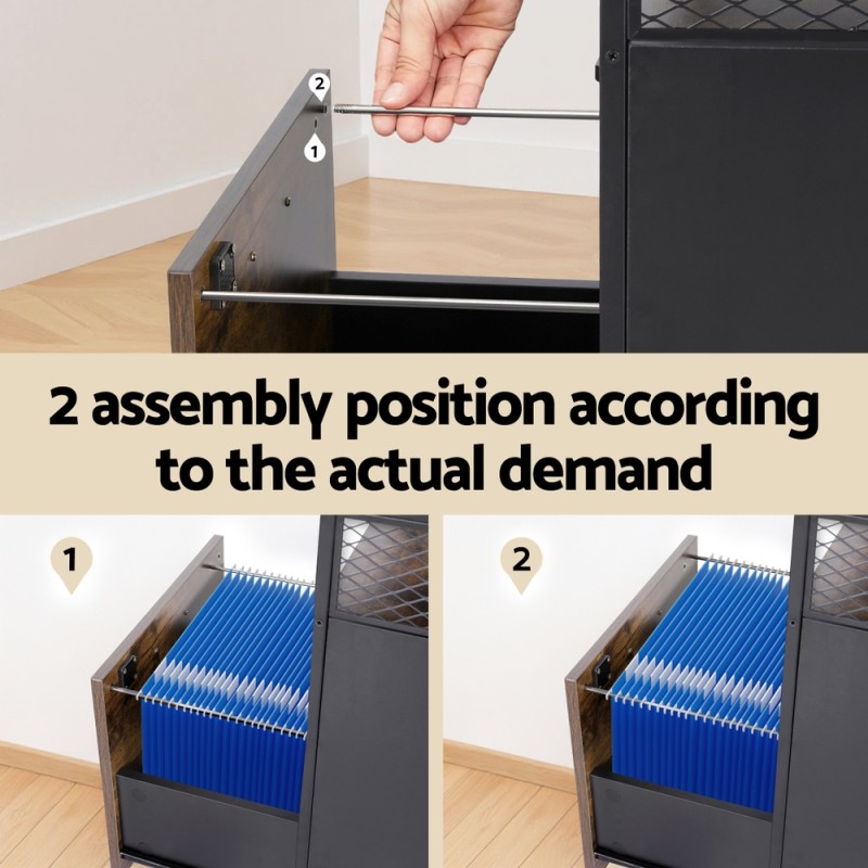 Enhance your office organisation with the Artiss Filing Cabinet, a perfect blend of style and functionality. Its rustic wood finish exudes charm, while smooth-rolling lockable wheels offer mobility and stability. Featuring two secure locking drawers, this cabinet ensures your files are safe and organised. The 75kg-capacity top shelf provides additional space for office essentials. Adjustable hanging folders accommodate A4 and letter file sizes, and matte black handles add a modern touch. Built with a sturdy steel frame, this cabinet is designed to last, making it an ideal choice for both home and office environments. Please follow safety warnings to prevent tip-overs.