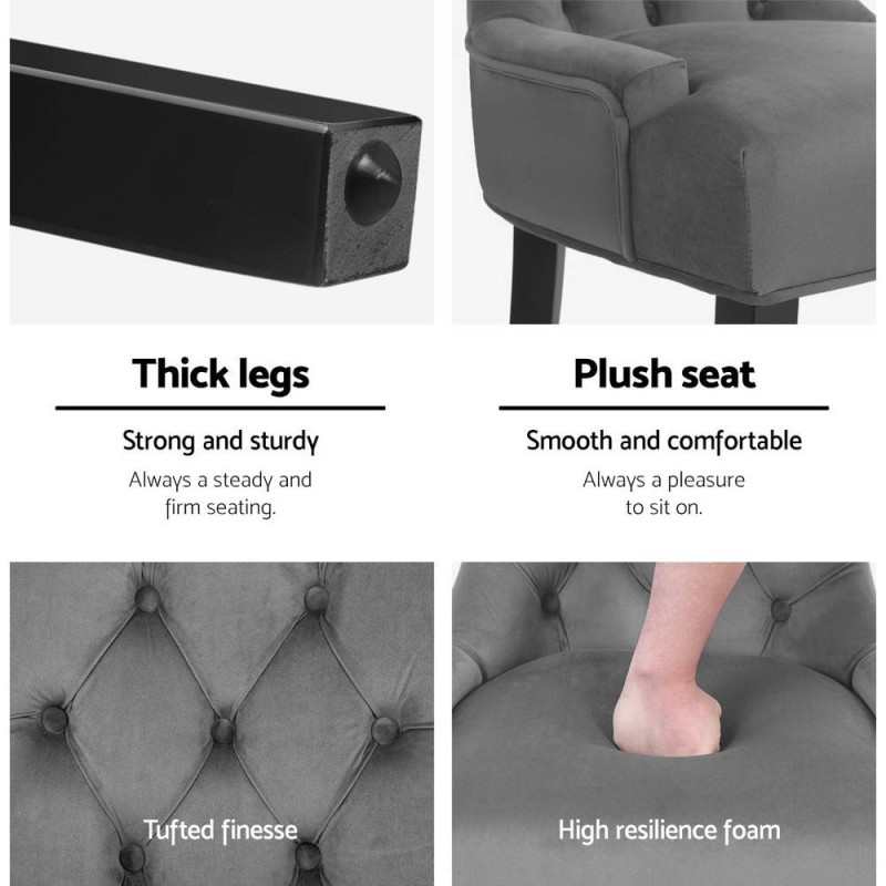 Elevate your dining experience with the 'Artiss Dining Chairs Set of 2 Velvet French Provincial Grey.' These chairs are a perfect blend of elegance and comfort, featuring soft grey velvet upholstery that complements any decor. The Cayes Dining Chair exudes French Provincial charm with its tufted button design and iconic curved back legs. Crafted with a robust rubber wood frame and deep 13cm high resilience foam, these chairs promise durability and comfort. Whether for daily dining or special occasions, the Cayes Chair adds a touch of sophistication to your home. Note: Slight colour variations may occur due to screen settings.