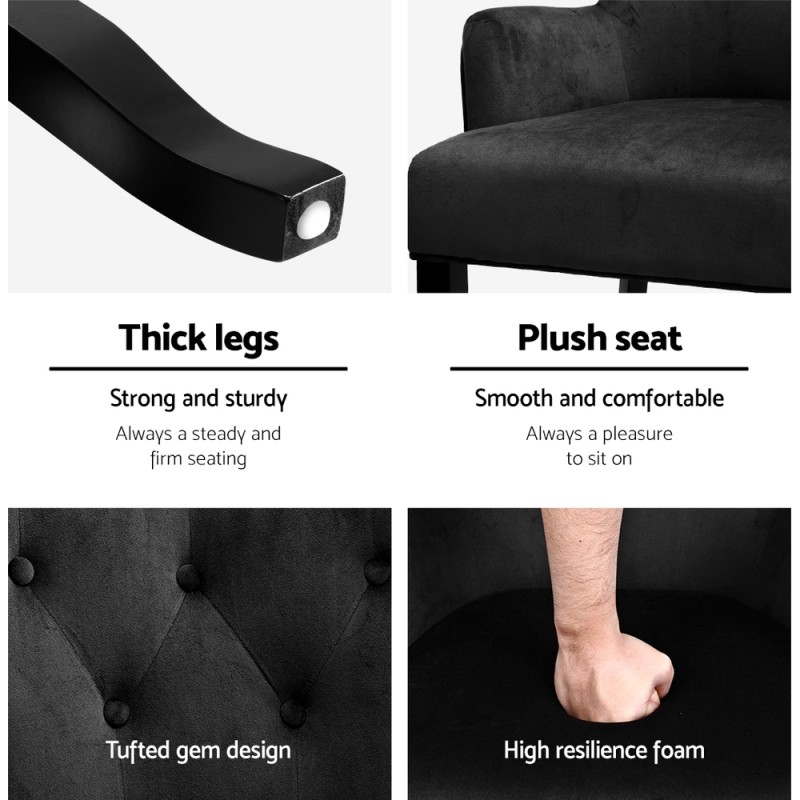 Infuse your dining space with the timeless elegance of the Artiss Cayes Dining Chair, a masterpiece of French Provincial charm. Upholstered in luxurious black velvet, this chair boasts a 13cm thick seat cushion made of high resilience foam, ensuring comfort and durability. The tufted button design, along with iconic curved back legs and turned front legs crafted from solid rubber wood, exudes sophistication and style. Perfectly balancing aesthetics and functionality, this chair is a stunning addition to any home seeking a touch of classic elegance.