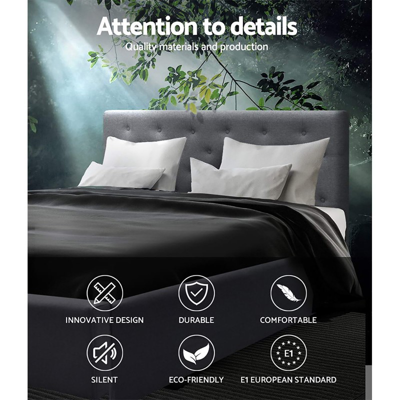 Discover the perfect blend of style and functionality with the Artiss Vila Gas Lift Bed Frame. This contemporary double-sized bed frame features a plush tufted headboard upholstered in premium grey faux linen fabric, exuding elegance and superior craftsmanship. Beyond its stunning exterior, it offers ample storage space beneath its wooden arched slat base, easily accessible with a convenient gas lift system. Designed with reinforced steel bars and heavy-duty metal connectors, this bed frame ensures stability and minimises movement disturbances for a restful sleep. Please note, the mattress is sold separately.