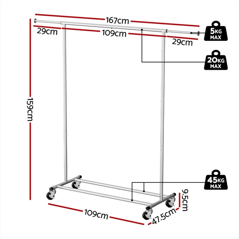 Organise outfits effortlessly with the Artiss Heavy-Duty Clothes Rack, combining industrial strength with smart design. The corrosion-resistant metal frame ensures long-lasting support for coats, dresses, or other items. Glide smoothly across floors with 360° swivel casters, and two lockable wheels keep the rack stationary when needed. Adjust the horizontal rod length to accommodate different clothing sizes, while protective plastic caps shield walls from scratches. Collapse the rack vertically for under-bed or cupboard storage. Perfect for rental spaces, retail displays, or daily home use!