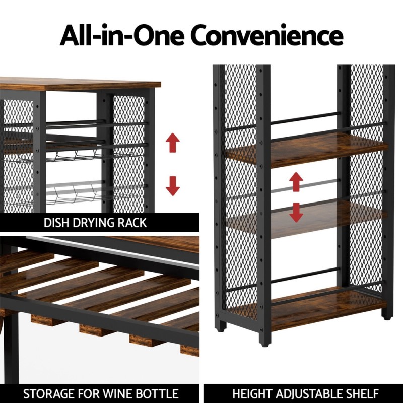 Elevate your space with the Artiss Industrial Bar Table, where urban style meets smart functionality. Ideal for compact rooms, its extendable design adapts to your needs, while a built-in wine rack and dual cupholders keep essentials organised and within reach. Crafted from powder-coated steel and MDF in a walnut finish, this durable centrepiece is perfect for hosting, displaying decor, or daily use. Transform any corner into an instant entertaining hub with easy assembly and all-in-one convenience, backed by a 1-year warranty.